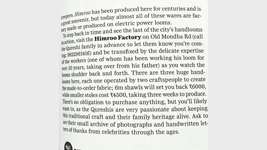 Under the section titled “The Last Looms Visit the Last Himroo Handloom,” the book directs travelers to the Himroo Factory on Old Mondha Road in Aurangabad, highlighting it as one of the last remaining authentic handloom centers in the city.