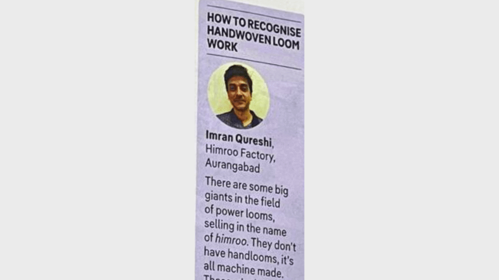 The book emphasizes that most Himroo available today is machine made, but visitors can witness authentic handloom weaving at Aurangabad Himroo Factory.